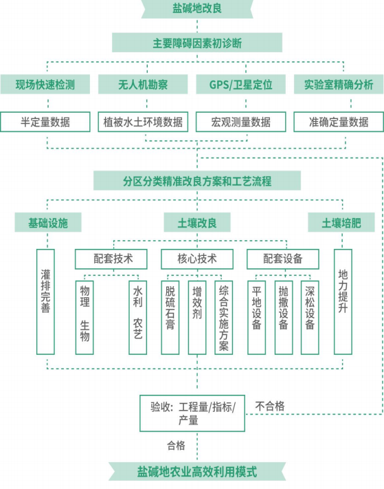 利用脱硫石膏进行盐碱地改良,变废为宝。实现了真正的循环经济。 脱硫石膏的施加可以有效降低土壤黏粒、促进土壤微 团聚体的形成;脱硫石膏可降低土壤碱性而提高团聚体稳定性,进而 减少有机质的矿化;脱硫石膏是改善土壤结构的主要因素。技术体系: