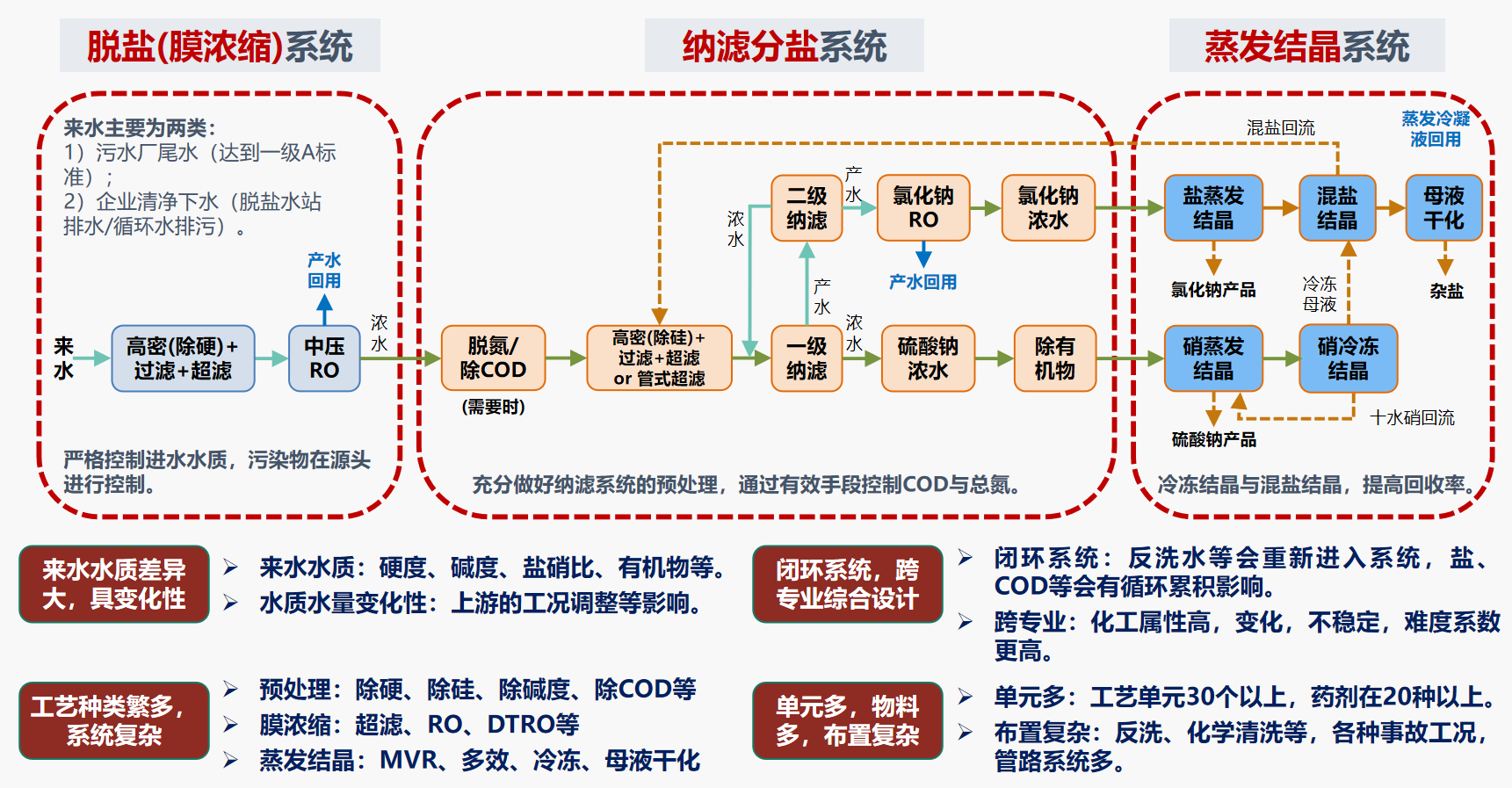 西北地区工业园区污水需要全部考虑回用,由于工业园区污水的来水含盐量普遍较高(平均TDS经常大于5000mg/L),而回用水要求较低的含盐量(一般要求TDS在1000mg/L以下)。工业园区污水在去除常规污染物的同时,还要实现脱盐,通过膜浓缩、分盐、蒸发结晶等工艺,将盐析出回用,实现整体系统的“近零排放”。涉及到的处理工艺有: