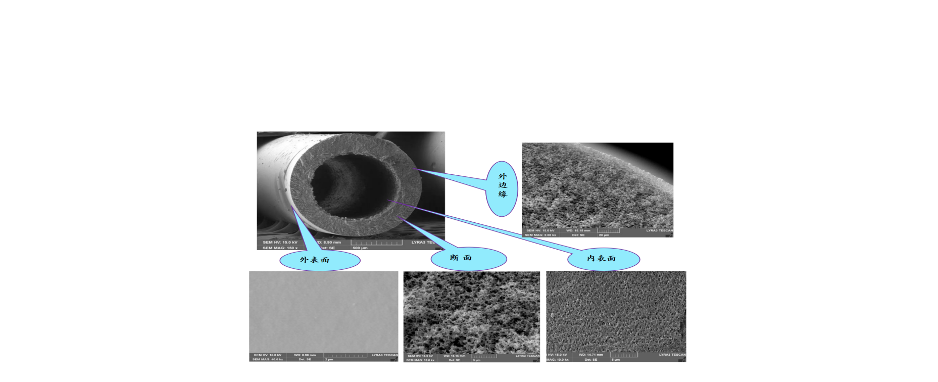 从下图可以看出膜断面为非对称型孔结构,膜的最外表面孔致密,外边缘孔径小,从外向内孔径逐渐增大,断面呈双连续的网络结构。